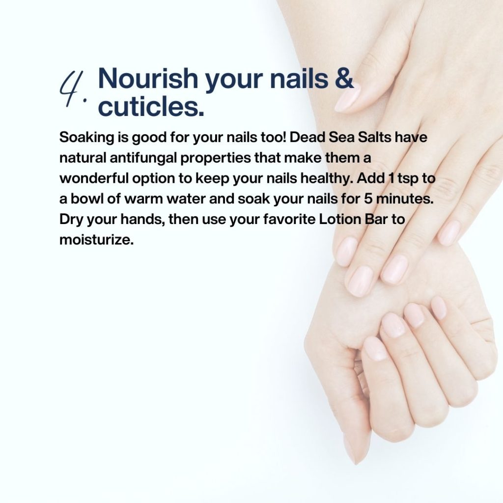 Strengthen Nails and Cuticles: Soak nails in a mixture of 1 tsp Magnesium Dead Sea Salt, 1 drop